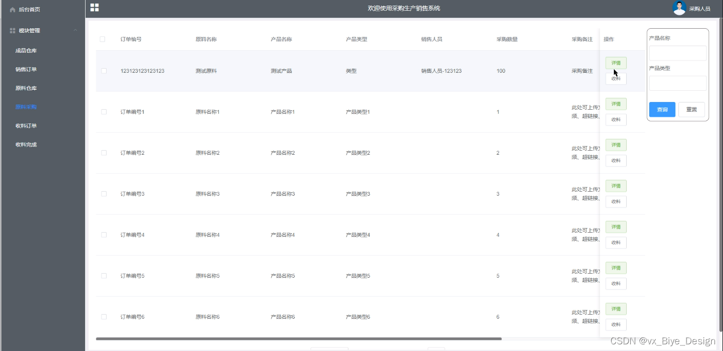 收料完成管理,在收料完成管理页面中可以对订单编号、原料名称、产品名称、产品类型、销售人员、采购数量、完成时间等信息进行详情等操作,如图5-8所示。