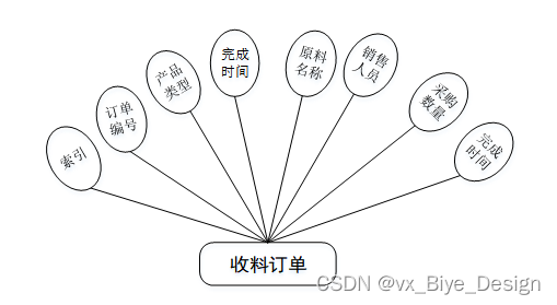 收料订单管理实体属性主要包括索引、订单编号、产品类型、完成时间、原料名称、销售人员、产品名称、采购数量等属性。收料订单管理实体属性图如图4-6所示。