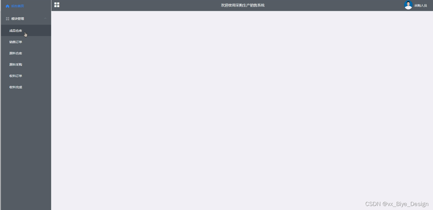 采购人员登录进入采购生产销售系统可以对首页、个人中心、模块管理(成品仓库、销售订单、原料仓库、原料采购、收料订单、收料完成、)等进行相应的操作管理,如图5-6所示。