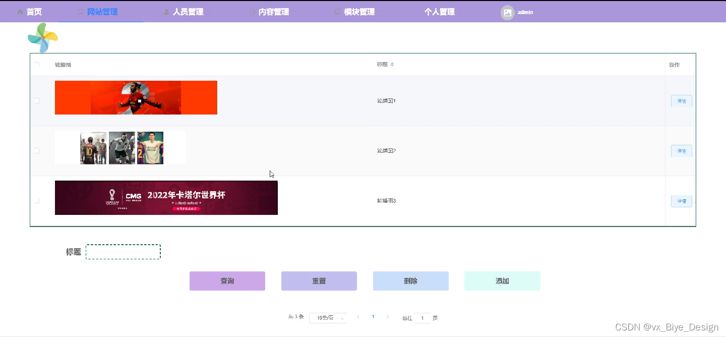 轮播图管理,在轮播图管理页面中可以添加通知信息:轮播图、标题等信息,还可在轮播图管理页面对轮播图信息进行添加、删除或详细等操作,如图5-13所示。