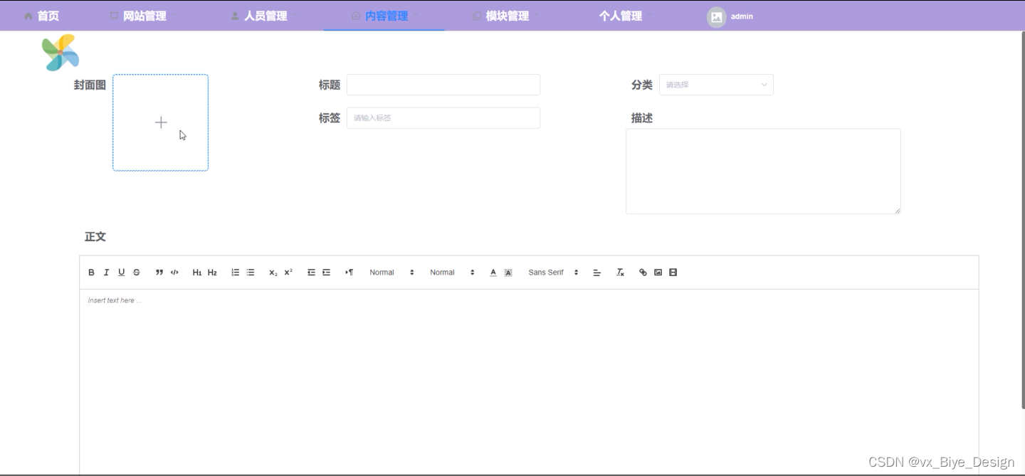 内容管理,管理员在内容管理页面可以查看新闻资讯+新闻分类两个子菜单,并可以添加新闻资讯信息,比如:封面图、标题、标签、分类、描述、正文等详细信息,并可根据需要进行分类、修改或删除等操作,如图5-14 5-15所示。