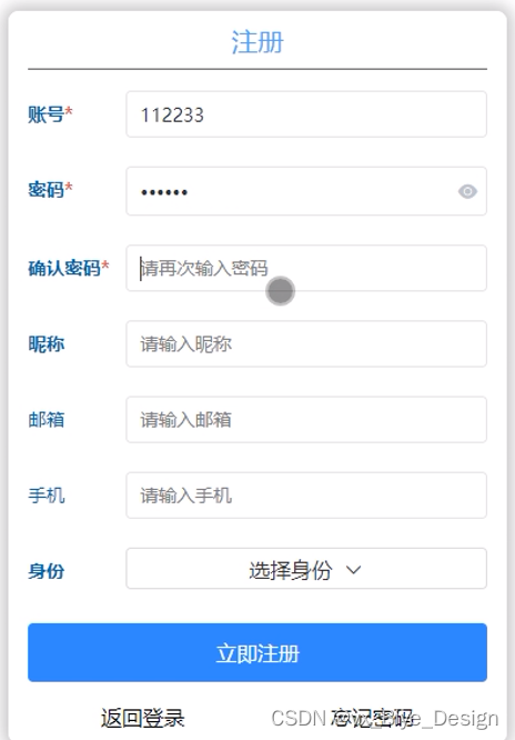 校园体育设施管理系统小程序主注册页面通过填写账户、密码、确认密码、昵称、邮箱、手机、身份、用户姓名、用户性别等信息完成用户注册,如图5-1所示。用户在登录页面通过用户名、密码信息进入系统,如图5-2所示。