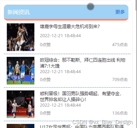 新闻资讯,在新闻资讯页面可以查看资讯标题、资讯描述、封面图片、点赞数、点击数等信息,可对喜欢的资讯信息进行点赞、收藏和发表评论等操作;如图5-5所示。