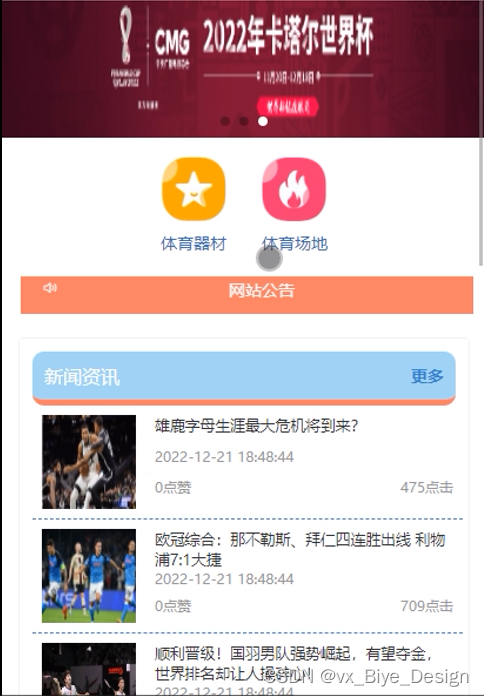 首页,可以进行首页、体育场地、网站公告、基本信息、体育器材、新闻资讯、器材借用、场地租借、基本信息等功能模块的查看与操作,如图5-4所示。