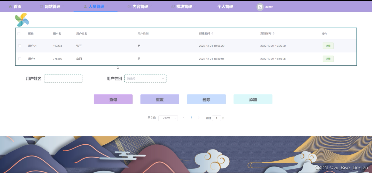 人员管理,在人员管理页面可以查看用户名、昵称、用户姓名、用户性别、等内容,并可根据需要进行修改或删除操作,如图5-12所示。
