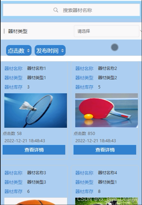 体育器材,在体育器材页面可以通过器材名称或器材类型进行搜索自己所需的器材详细介绍,可进行收藏或在线借用操作如图5-6 5-7所示。
