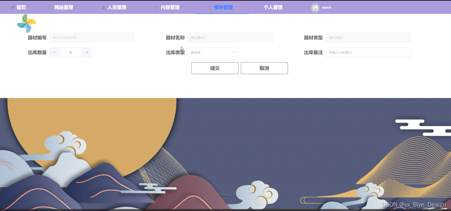 在管理员功能页面可以查看首页、网站管理(轮播图、公告栏)人员管理(管理员、系统用户)内容管理(新闻资讯、新闻分类)、模块管理(体育器材、类型管理、器材借用、器材入库、器材出库、体育场地、场地租借)个人管理等功能。系统管理等内容进行相对应操作,如图5-11所示。