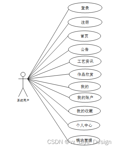 通过2.3功能的分析,得出了本手工艺品在线展示系统的用例图: