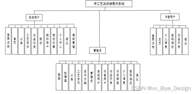 按照手工艺品在线展示系统的角色,我划分为了作者用户管理模块、系统用户管理模块和管理员管理模块这三大部分。