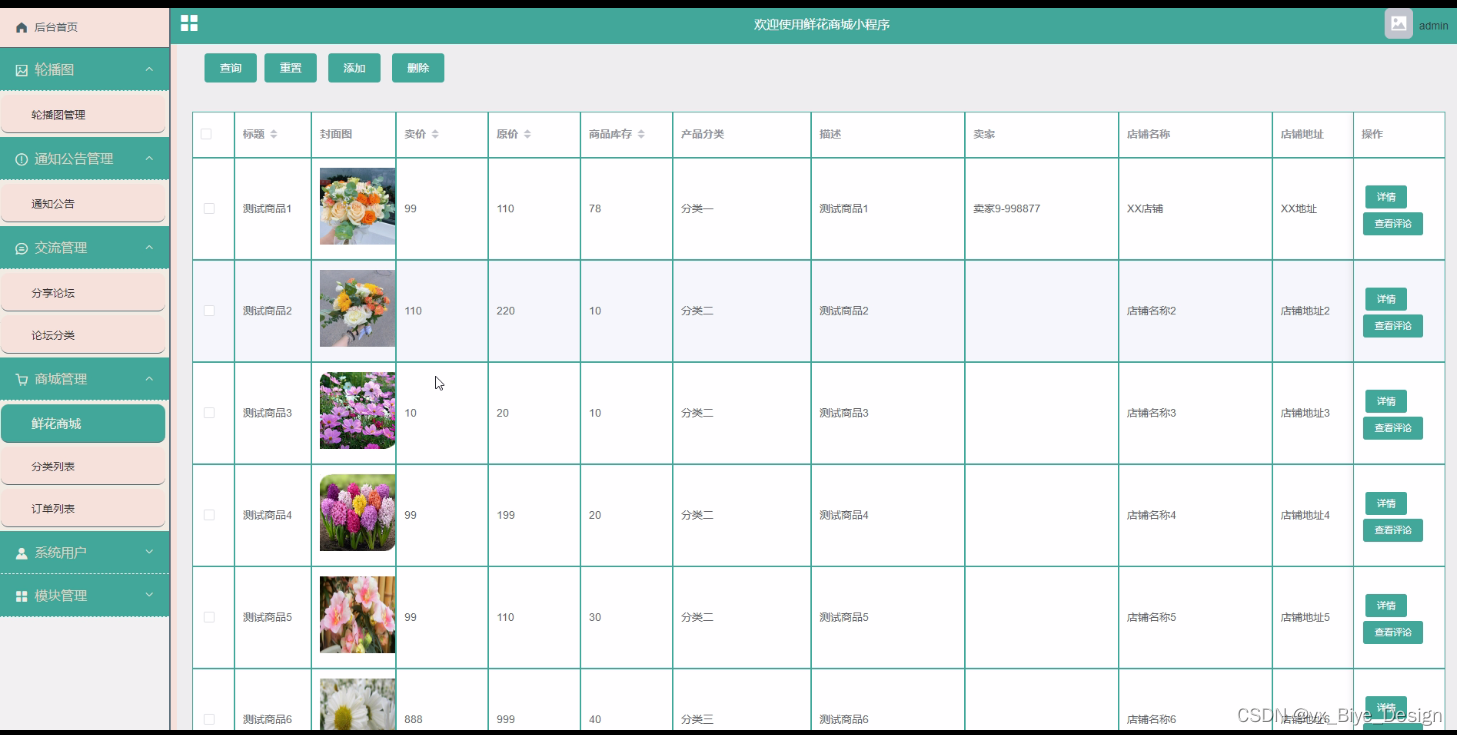 在管理员功能页面可以查看,首页、轮播图、通知公告、交流管理(分享论坛、论坛分类)商城管理(鲜花商城、分类列表、订单详情)系统用户(管理员、普通用户、卖家)模块管理(物流信息、商品售后)等内容进行相对应操作,如图5-7所示。