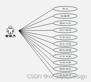 基于微信小程序的鲜花商城基于现有的手机,可以实现管理员,首页、轮播图、通知公告、交流管理(分享论坛、论坛分类)商城管理(鲜花商城、分类列表、订单详情)系统用户(管理员、普通用户、卖家)模块管理(物流信息、商品售后)等详细的了解及统计分析,根据系统功能需求建立的模块关系图如下图: