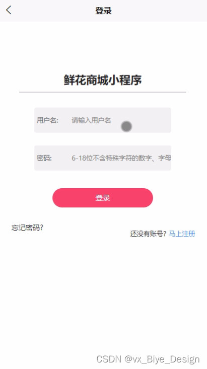 微信小程序的鲜花商城登录界面,通过填写账号、密码、等信息进行登录,如图5-1所示。