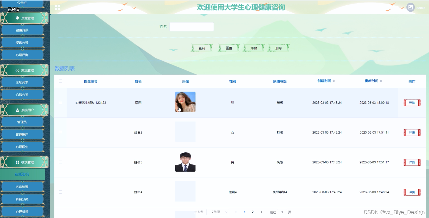本设计主要实现集人性化、高效率、便捷等优点于一身的大学生心理健康咨询小程序,完成在线咨询、咨询管理、科普分类、心理科普等功能模块。系统通过浏览器与服务器进行通信,实现数据的交互与变更。本系统通过科学的管理方式、便捷的服务提高了工作效率,减少了数据存储上的错误和遗漏。大学生心理健康咨询小程序使用Java语言,采用基于 MVVM模式的springboot技术进行开发,使用 Eclipse 2017 CI 10 编译器编写,数据方面主要采用的是微软的MySQL数据库来作为数据存储媒介,配合前台HTML+CSS 技术完成系统的开发。