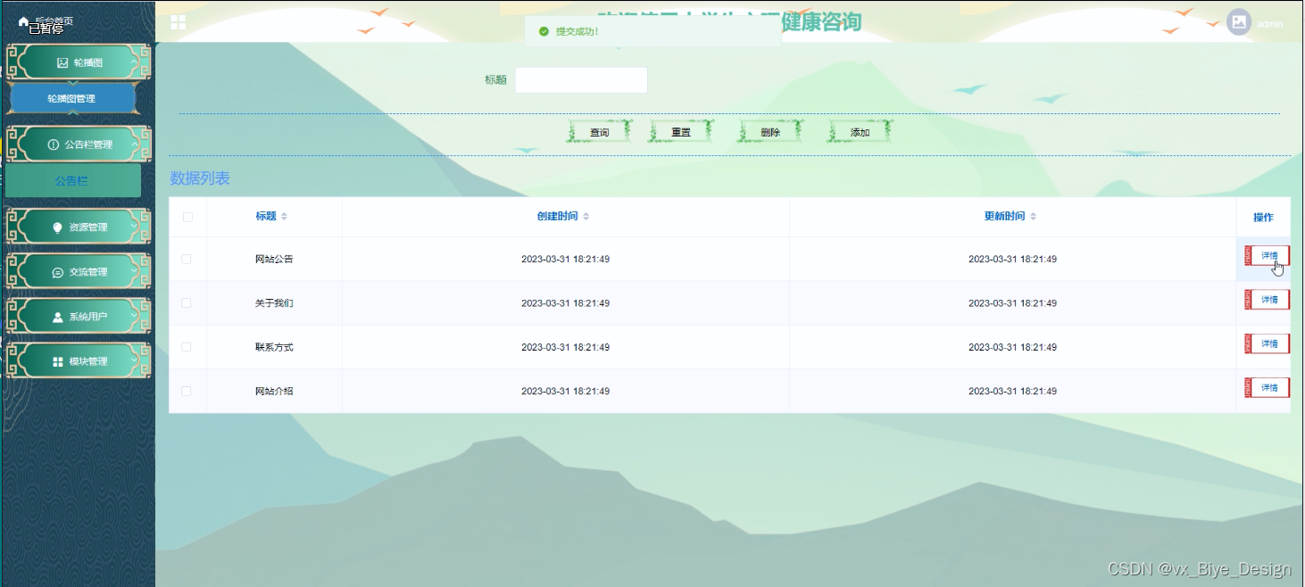 | 主事件流 | (1)管理员进入咨询管理页面,查询咨询的信息 (2)管理员可以对咨询进行增删除和编辑咨询操作 (3)管理员新增咨询,添加成功跳转到查询页面 |