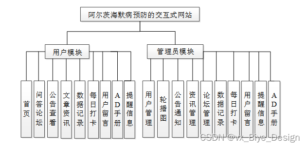 阿尔茨海默病预防的交互式网站总体分为前台用户模块和后台管理员模块。
