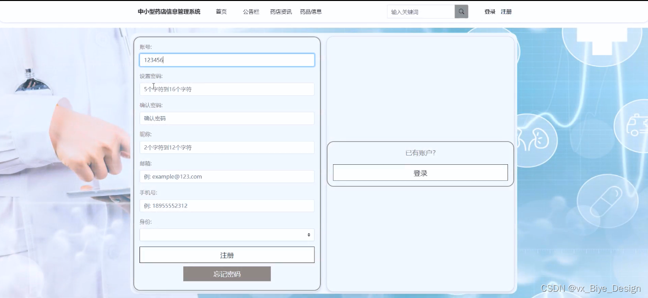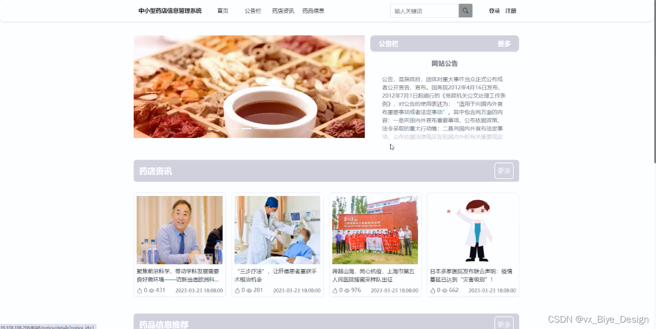 (2)查看中小型药店信息管理系统的首页信息:中小型药店信息管理系统的首页信息包含了首页、公告信息、药店资讯、药品信息、个人账户、个人收藏、个人中心。