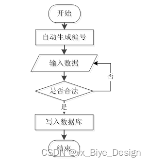 用户成功登入系统后能够实现增加数据的操作,增加数据的编号是特定的,系统生成,用户不能随意填写,除了编号以外,其他增加信息用户自己填写,填写后的信息经过系统验证,验证合法通过就显示增加数据成功了,相反的话,就没有增加成功,图2-1显示的就是在增加数据时的流程。