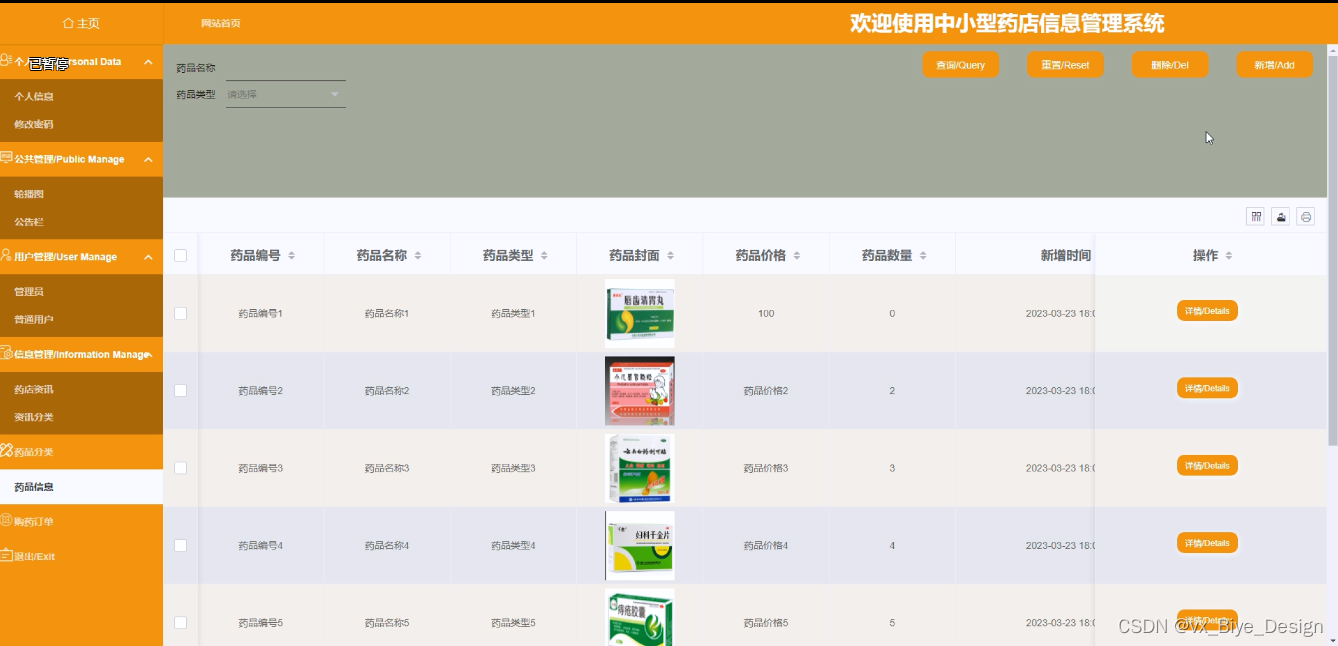 (4)药品信息:管理员点击“药品信息”会显示出所有的药品信息,支持通过药品信息状态或者输入药品编号或者药品名称对药品信息进行查询,如果想要添加新的药品信息,点击“添加”按钮,输入相关信息,点击“提交”按钮就可以添加了,同时可以选择某一条药品信息,点击“删除”进行删除。