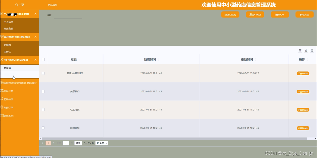 (3)信息管理:管理员可以对中小型药店信息管理系统前台展示的药店资讯以及资讯分类进行管控。