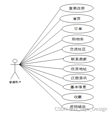 通过2.3功能的分析,得出了本Springboot汉服销售系统小程序的用例图: