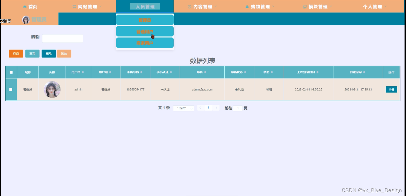 (2)人员管理:管理员可以对Springboot汉服销售系统小程序中所有的用户进行管控,包括了管理员和商家用户、普通用户。