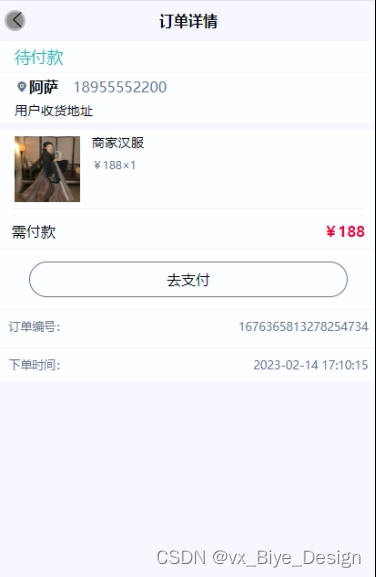 (5)汉服购买:用户对喜欢的汉服可以加购,在购物车里面,当用户确定提交完毕后,将其提交给服务器后台系统,并生成订单。
