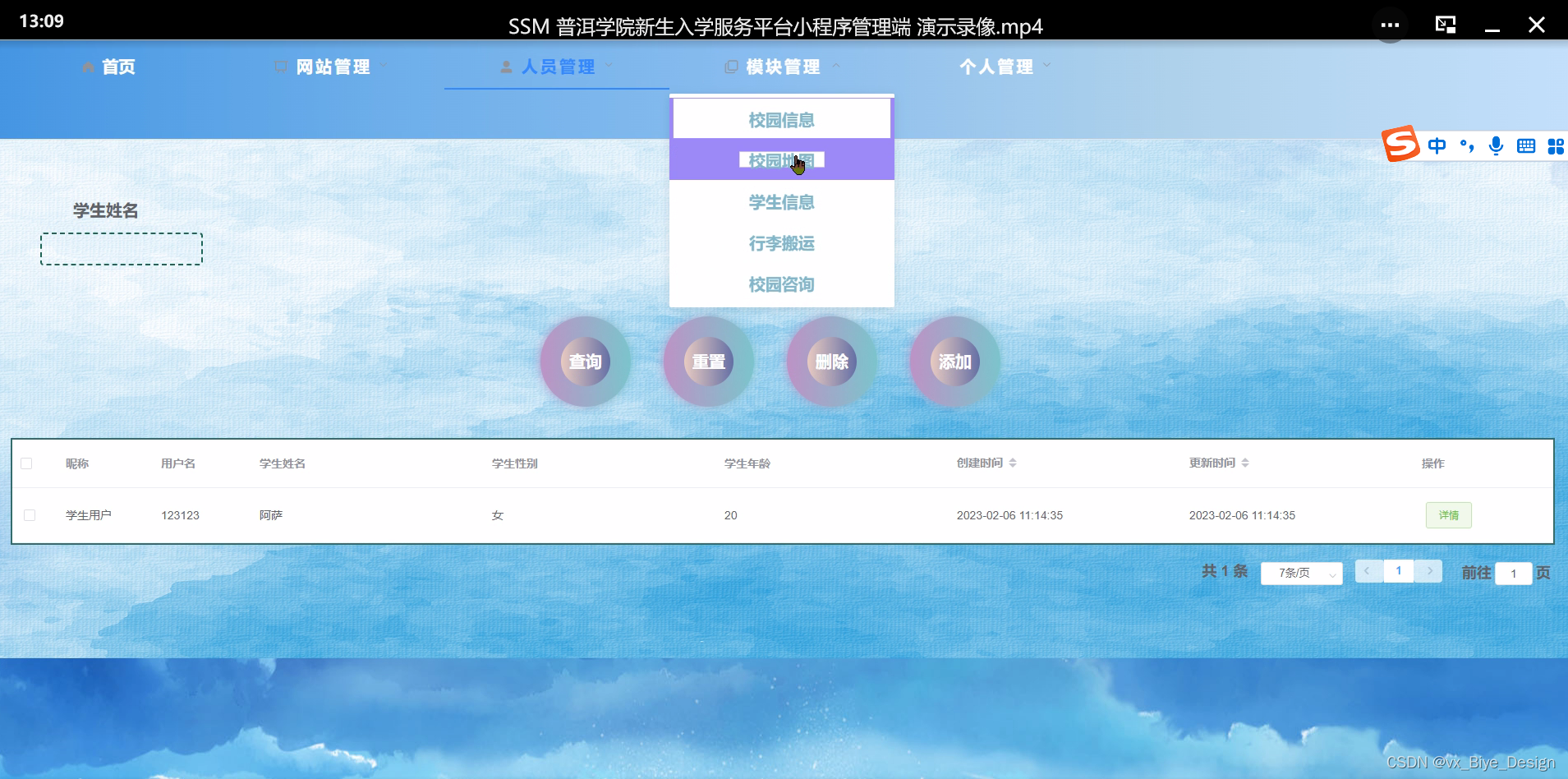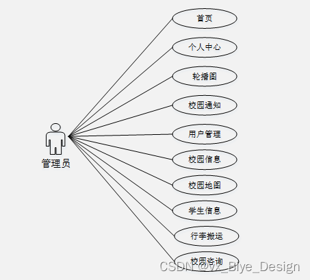在管理员功能页面可以查看首页、网站管理(轮播图、校园通知)人员管理(管理员、学生用户、工作人员)模块管理(校园信息、校园地图、学生信息、行李搬运、校园咨询)个人管理、系统管理等内容进行相对应操作,如图5-10所示。