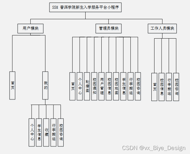 基于普洱学院新生入学服务平台小程序的设计基于现有的手机,可以实现首页、网站管理(轮播图、校园通知)人员管理(管理员、学生用户、工作人员)模块管理(校园信息、校园地图、学生信息、行李搬运、校园咨询)个人管理等功能。方便用户对首页、我的(个人信息、收藏、学生信息、行李搬运、校园咨询)等详细的了解及统计分析。根据系统功能需求建立的模块关系图如下图: