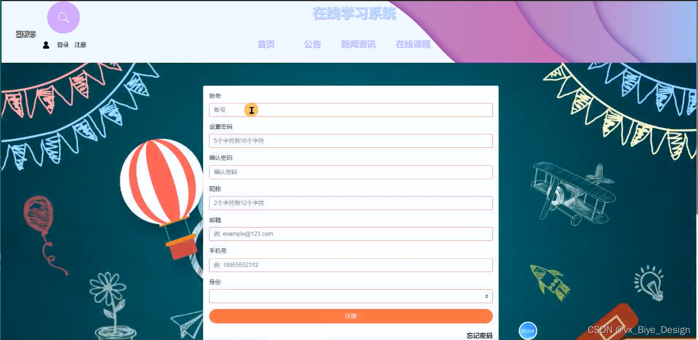 不是在线学习系统中正式用户的是可以在线进行注册的,如果你没有本在线学习系统的账号的话,添加“注册”,当填写上自己的账号+密码+确认密码+昵称+邮箱+手机号等后再点击“注册”按钮后将会先验证输入的有没有空数据,再次验证密码和确认密码是否是一样的,最后验证输入的账户名和数据库表中已经注册的账户名是否重复,只有都验证没问题后即可用户注册成功。注册界面实现了用户用户的注册,其注册界面展示如下图4。2所示。