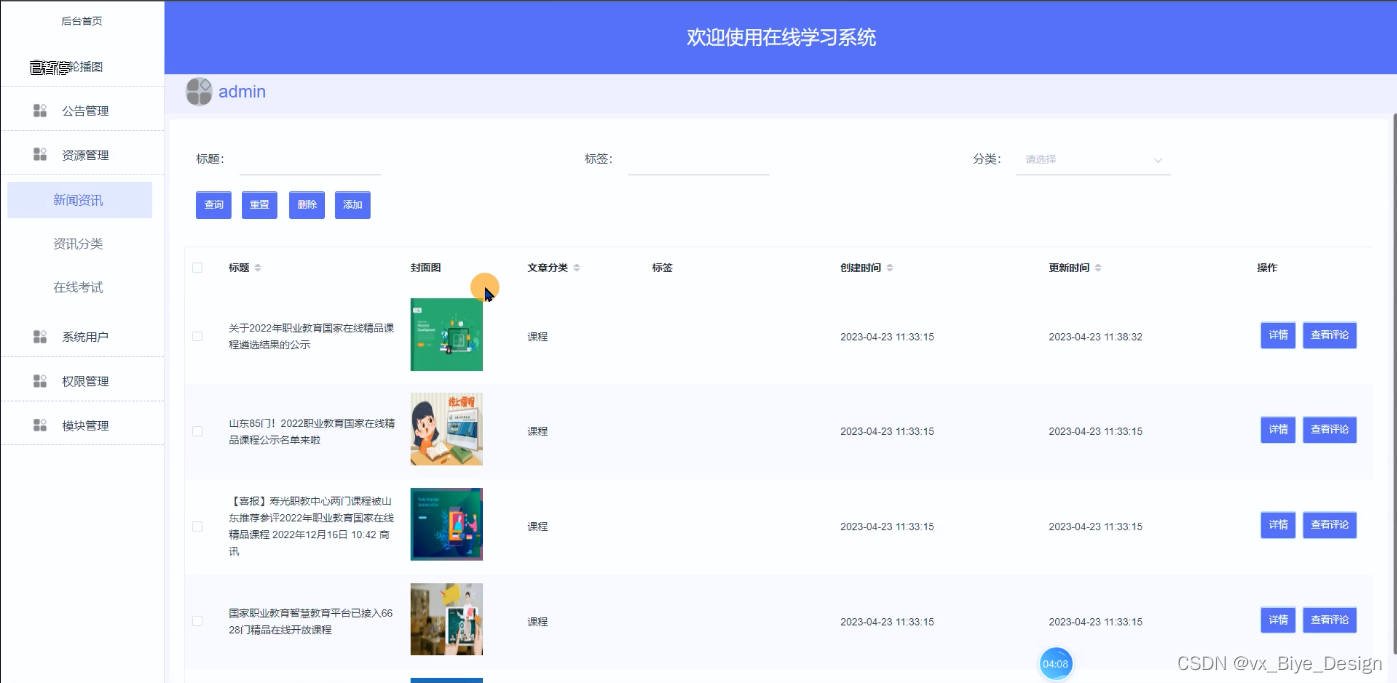 (3)资源管理:当点击“资源管理”这一菜单的时候,会出现新闻资讯+资讯分类+在线考试这三个子菜单,可以对这三个模块进行增删改查操作;