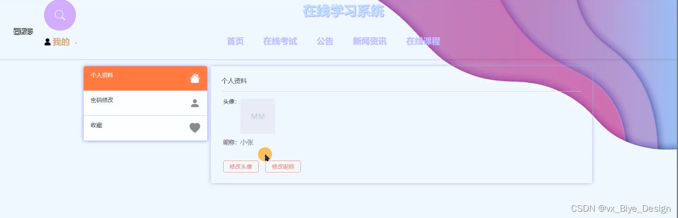 (4)个人中心:当用户点击右上角“我的”这个按钮,就会进入到对应的后台进行信息的管理了;