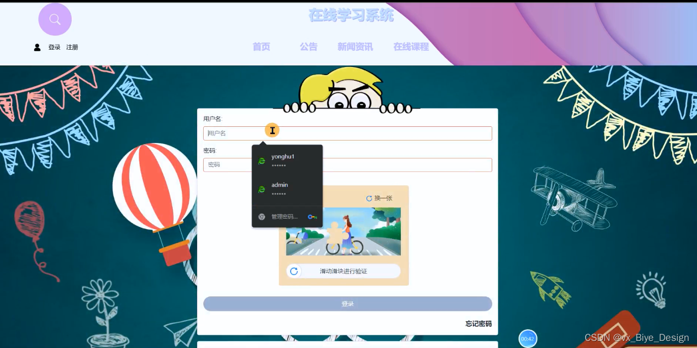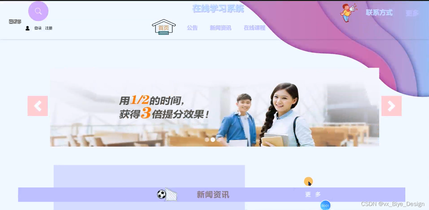 当进入在线学习系统的时候,首先映入眼帘的是系统的导航栏,下面是轮播图以及系统内容,其主界面展示如下图4.1所示。