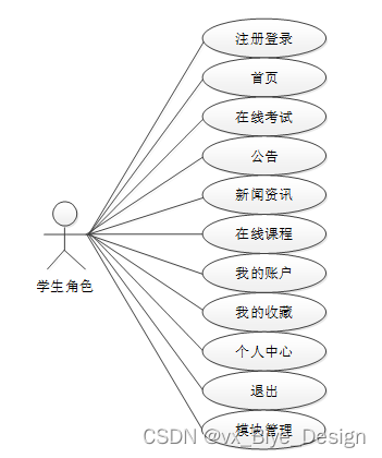根据上一节功能分析,可以得出系统的用例,学生角色用例如图2.1所示。