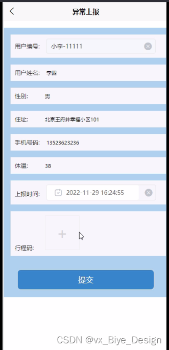 异常上报管理,在异常上报管理页面可以查看用户编号、用户姓名、性别、住址、手机号码、体温、上报时间、行程码等内容,并可根据需要进行修改或删除操作,如图5-13所示。