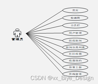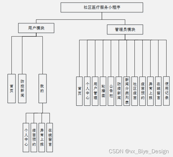 基于社区医疗服务小程序管理系统基于现有的手机,可以实现管理员:首页、轮播图、公告栏、资源管理(防疫新闻、新闻分类列表)系统用户(管理员、系统用户)模块管理(社区疫苗、疫苗预约、异常上报、在线留言)等详细的了解及统计分析。根据系统功能需求建立的模块关系图如下图:
