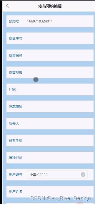 疫苗预约管理,在疫苗预约管理页面可以查看预约号、疫苗序号、疫苗名称、封面、疫苗数量、疫苗规格、厂家、注意事项、负责人、联系手机、接种地址等内容,并可根据需要进行修改或删除操作,如图5-12所示。