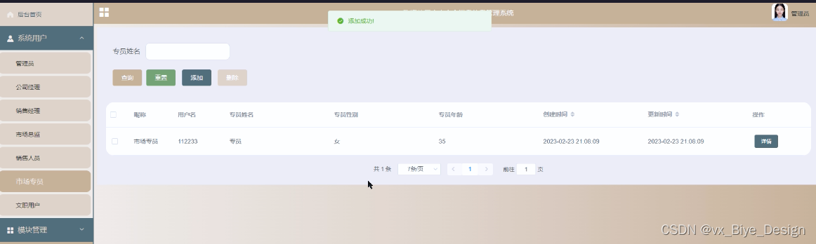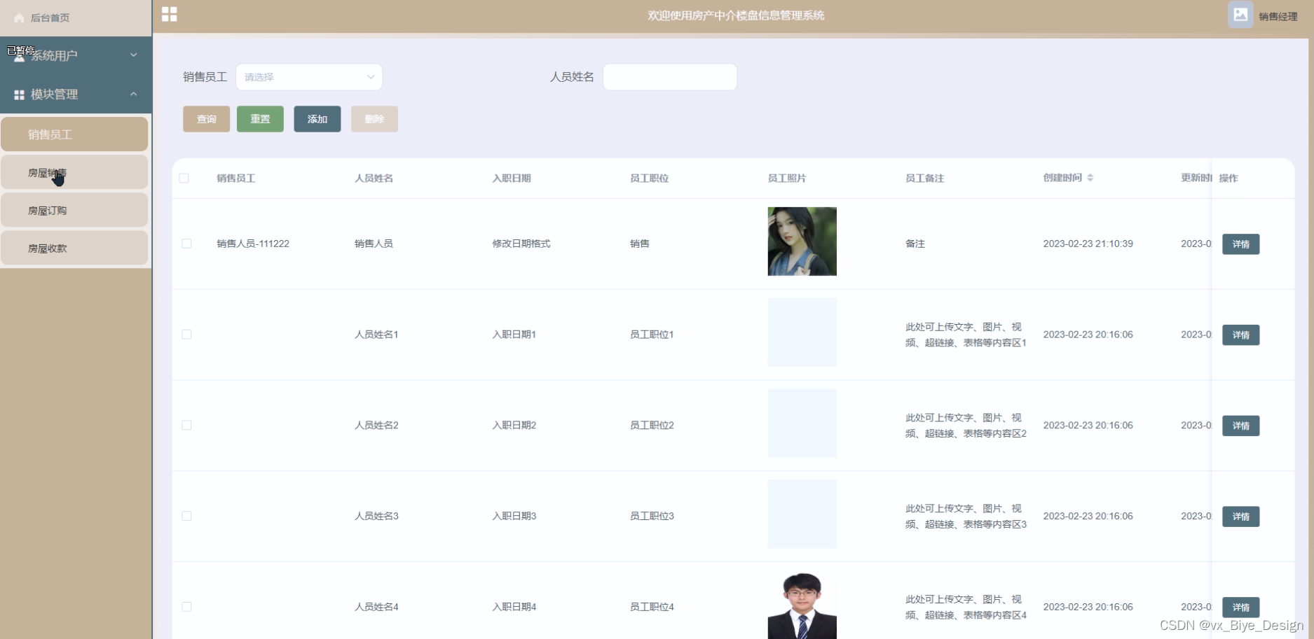 销售员工管理,在销售员工管理页面中可查看销售员工:销售员工、人员姓名、入职日期、员工职位、员工照片、员工备注等内容,还可在该页面进行休改删除或详细等操作 图5-9所示