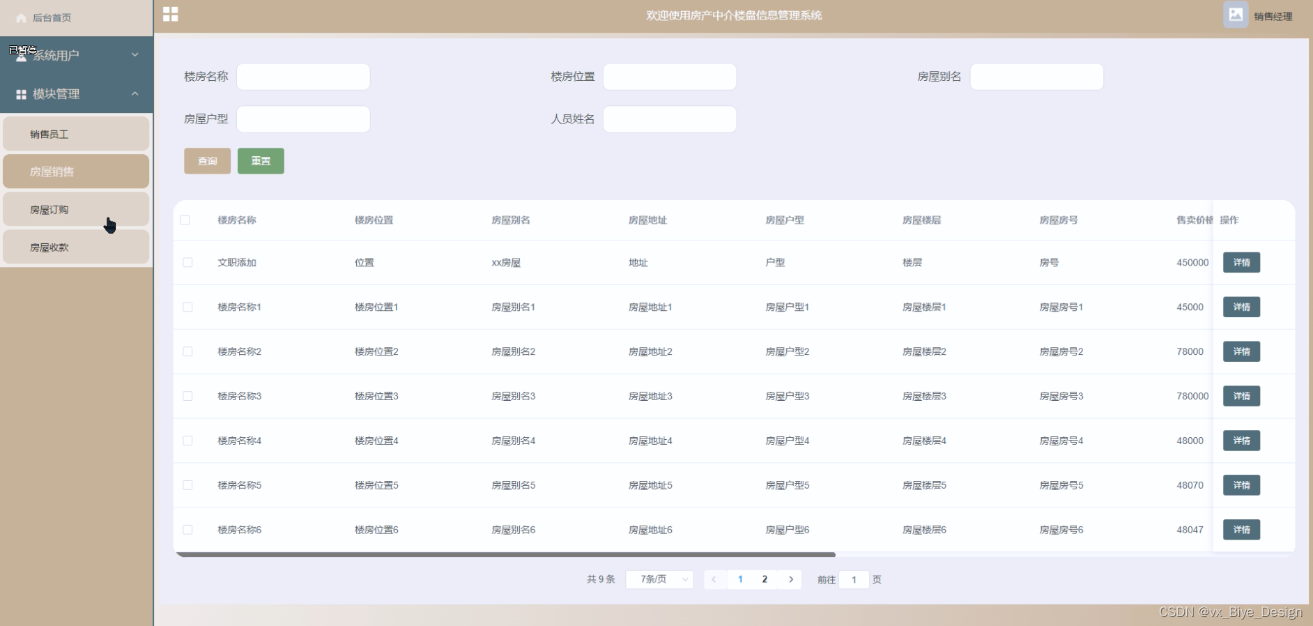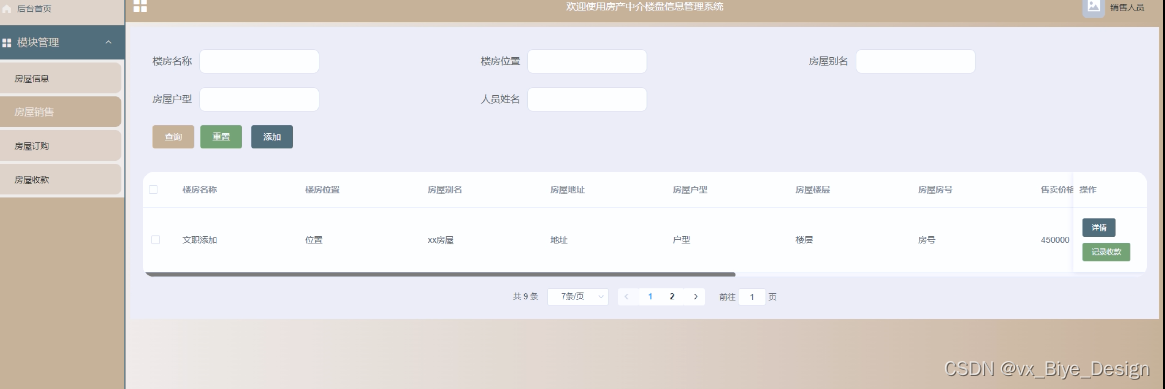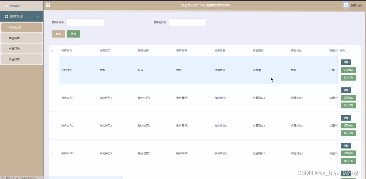 房屋销售管理,在房屋销售管理页面中可查看销售信息:楼房名称、楼房位置、楼房别名、房屋户型、房屋房号、房屋地址等内容,还可在该页面进行休改删除或详细等操作 图5-8所示