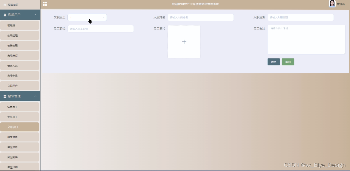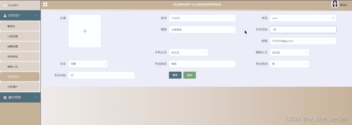 本文以java为开发技术,实现了一个房产中介楼盘信息管理系统。房产中介楼盘信息管理系统的主要使用者分为管理员、公司经理、销售经理、市场总监、销售人员、市场专员以及文职用户;管理员功能分为:销售员工、专员员工、文职员工、楼房信息、房屋信息、房屋销售、房屋订购、房屋收款、客户信息、客户退款等系统管理。销售经理:首页、销售人员、销售员工、房屋销售、房屋订购、房屋收款;文职用户分为:楼房信息、房屋信息、客户信息、客户退款等功能,销售人员分为:首页、房屋信息、房屋销售、房屋订购、房屋收款等功能,通过这些功能模块的设计,基本上实现了整个房产中介楼盘管理的过程。