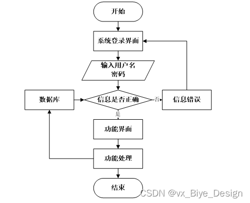 用户打开并进入系统后,会先显示登录界面,输入正确的用户名和密码,系统自动检测信息,若信息无误,则用户会进入系统功能界面,进行操作,否则会提示错误无法登录,操作流程如图3-3所示。