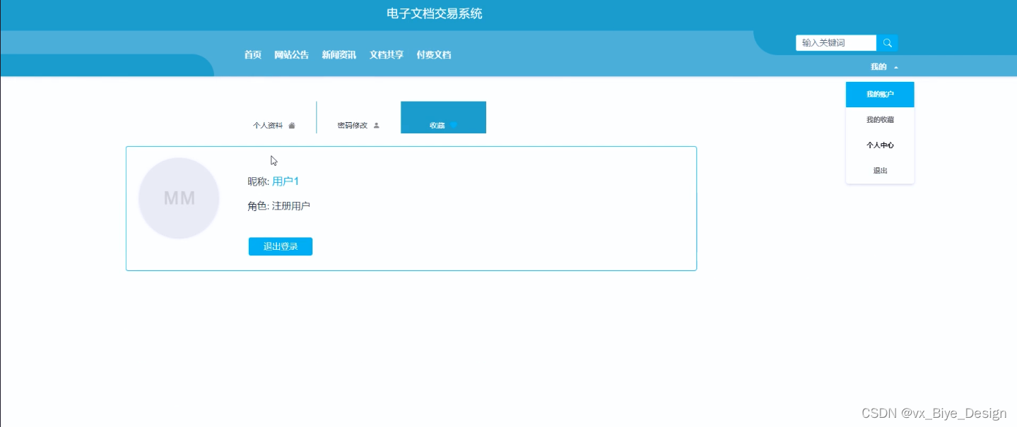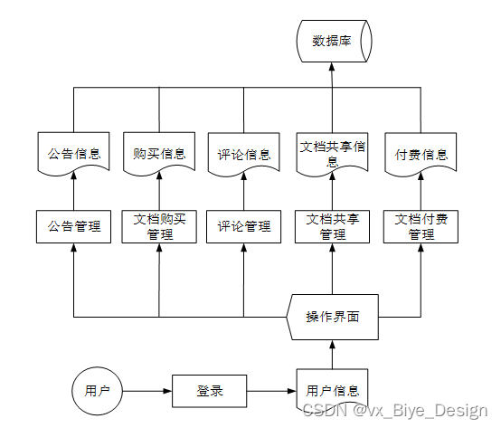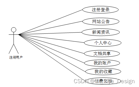 (1)用户注册登录:游客可以随时进入到系统中,对系统中的信息浏览,但是想要实现付费文档以及文档共享等操作,就必须有这个系统的账号,如果没有账号的话,可以注册以后进行相关的操作,同时用户还可以通过“我的账户”这以按钮对个人信息以及操作的信息进行管控。