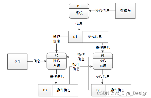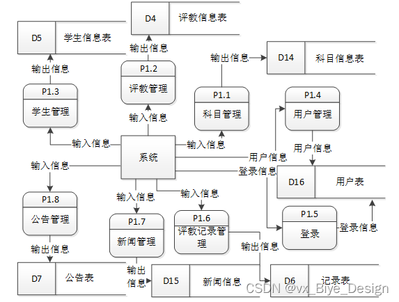 二层数据流程是对一层数据流层图中填写登录信息、用户功能的细化。即:填写登录信息细化为填制信息、后台审核,用户功能细化为首页、公告信息、新闻资讯、评教信息等操作。