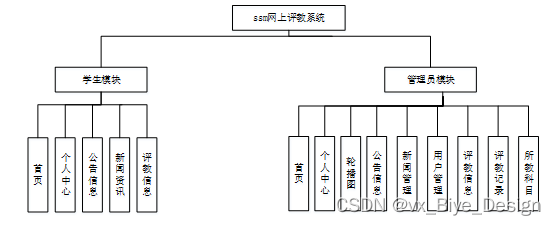 网上评教系统在对需求做解析后,整个系统主要分为管理员和学生,每个模块下的分支功能不一样。学生模块包括:首页、公告信息、新闻资讯、评教信息;管理员模块包括:首页、轮播图、公告信息、资源管理(新闻列表、新闻分类列表)系统用户(管理员、学生用户)模块管理(评教信息、评教记录、所教科目)管理等模块。