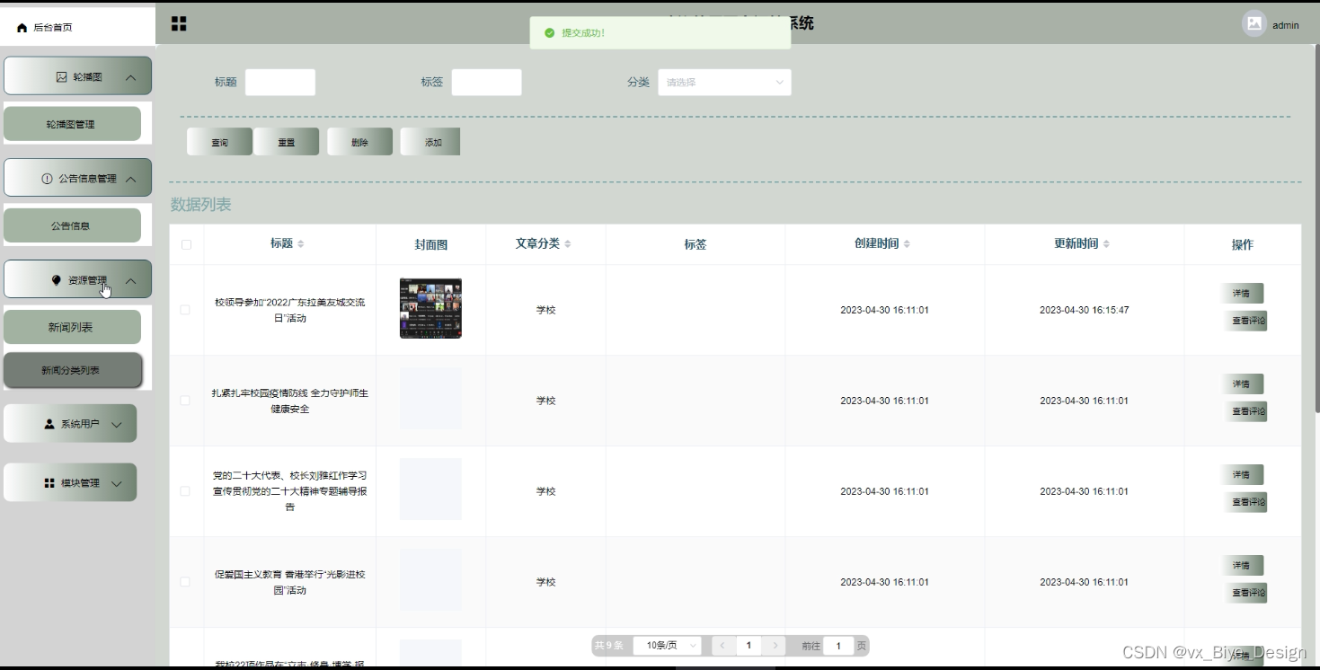 新闻列表管理,在新闻列表页面中对新闻信息进行添加内容:标题、封面图、文章分类、标签、创建时间等内容,还可在新闻查询页面对已有的新闻信息进行编辑删除详情等操作,如图5-5所示: