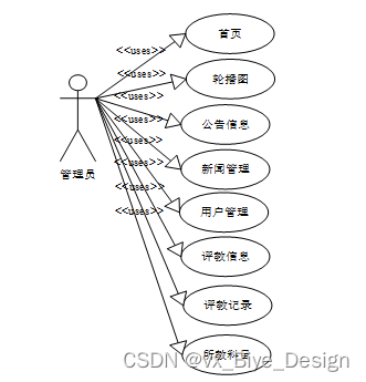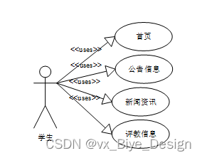 系统设计的目的是分析系统包括的所有功能结构,为开发人员设计开发和实现系统做好准备工作。经过前期的需求调查、分析和整理之后,确定的总体需求主要包括多个模块,分别是:首页、轮播图、公告信息、资源管理(新闻列表、新闻分类列表)系统用户(管理员、学生用户)模块管理(评教信息、评教记录、所教科目)。系统整体角色分为两个部分,一是学生、最后是管理员。权限分布也是很明显,学生用户是在除去浏览信息之外还具有查询和管理自己账户信息、评教信息等权限;管理员是最高权限拥有者。