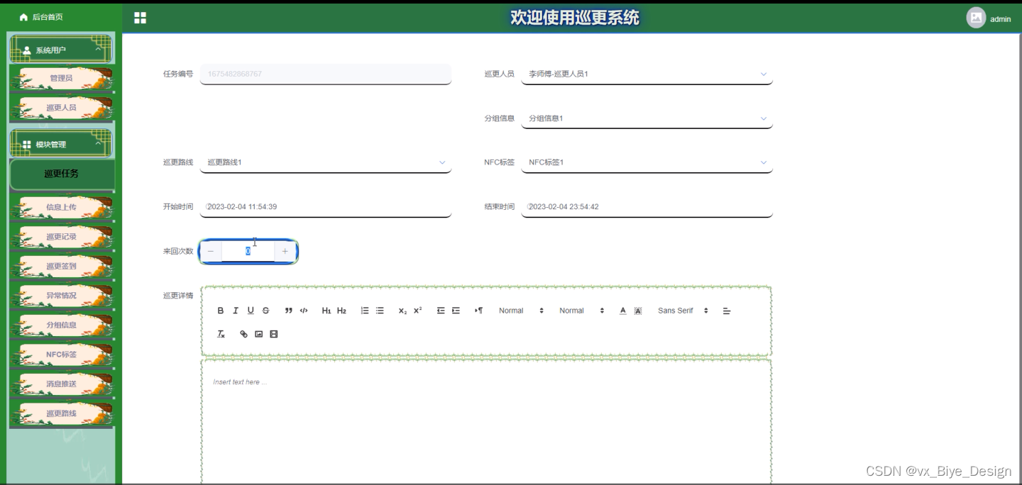 管理员在巡更任务页面编辑任务编号、巡更人员、巡更路线、分组信息、开始时间、结束时间、来回次数、巡更详情等内容进行增删改查等操作,如图5-4所示。