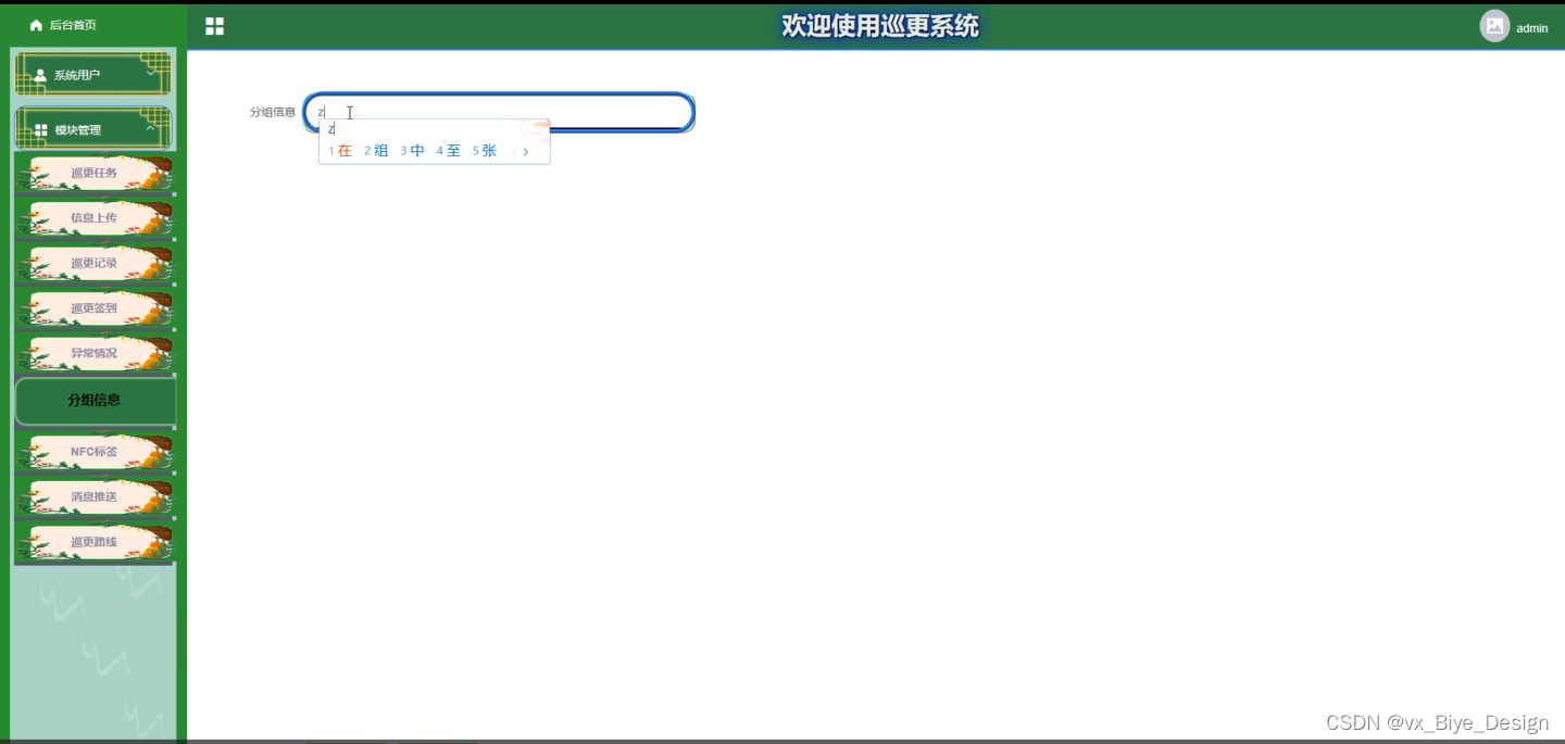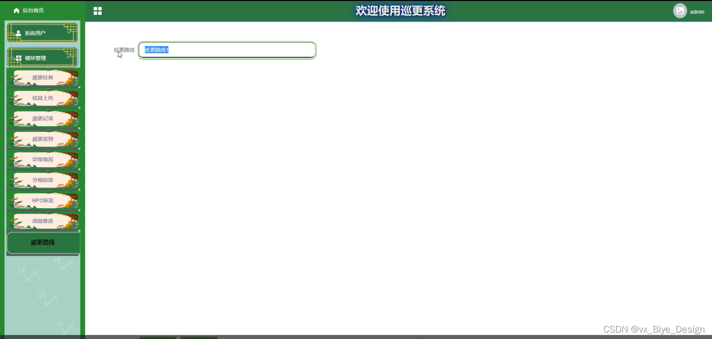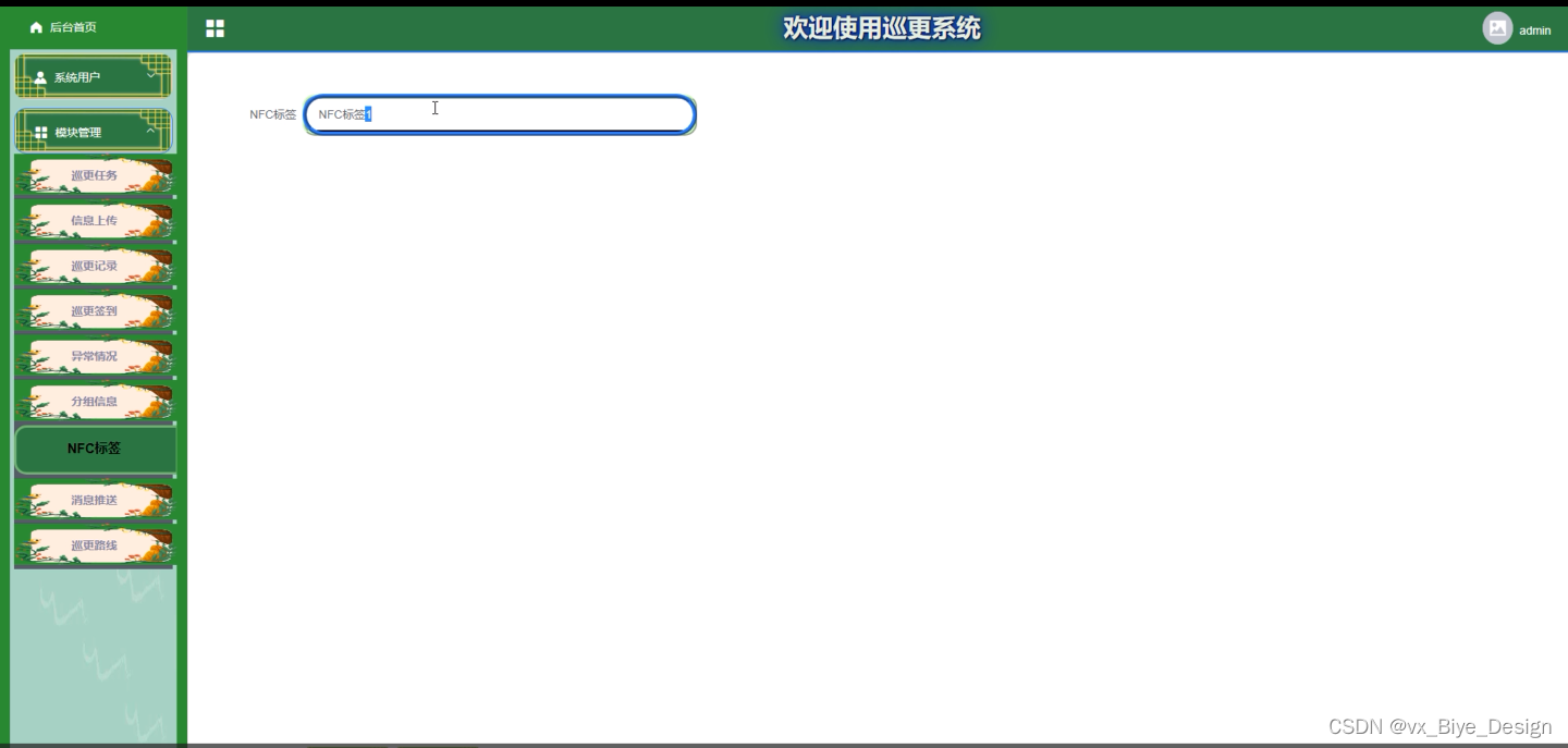 管理员进入系统后台可以查看:台首页,系统用户(管理中、巡更人员)模块管理(巡更任务、信息上传、巡更记录、巡更签到、巡更路线、异常情况、消息推送、分组信息、NTC标签)等功能模块,还可进行相应的操作,如图5-2所示。