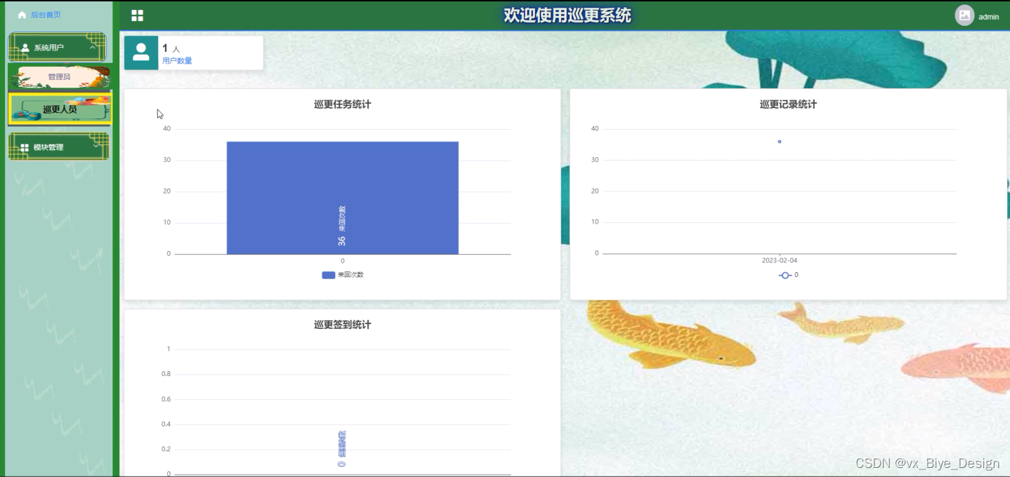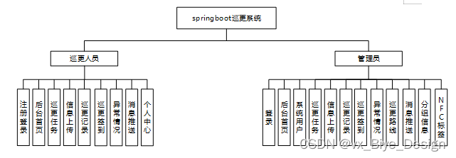 (1)功能要求:后台首页,系统用户(管理中、巡更人员)模块管理(巡更任务、信息上传、巡更记录、巡更签到、巡更路线、异常情况、消息推送、分组信息、NTC标签)等功能模块。
