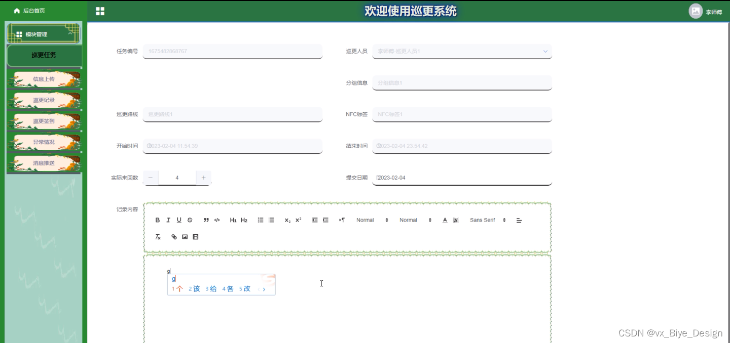 3、功能的完善性:拥有后台首页,系统用户(管理中、巡更人员)模块管理(巡更任务、信息上传、巡更记录、巡更签到、巡更路线、异常情况、消息推送、分组信息、NTC标签)等功能模块的修改维护操作。