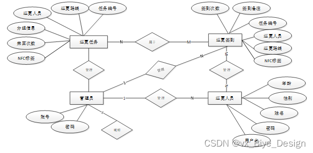 通过巡更系统的功能进行规划分成几个实体信息,实体信息将通过ER图进行说明,本系统的主要实体图如下: